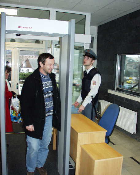 STŘELNÉ ZBRANĚ DO BUDOVY NEPATŘÍ Bezpečnost zaměstnanců Okresního soudu v Jičíně je od konce minulého roku lépe chráněna. V prostoru vstupu byl umístěn nový detekční rám, který reaguje na kovové předměty. "Podobná opatření byla zavedena ve všech soudních budovách. Na krajských soudech mají navíc k dispozici rentgen na zavazadla," uvedl velitel zdejší justiční stráže Martin Černý. Dodal, že i pro samotné návštěvníky je detekční rám mnohem důstojnější, než když se kontrola prováděla ručním detektorem. Nové zařízení svůj účel podle stráže splňuje, prakticky každý týden zde díky němu odhalí několik střelných zbraní a nožů, které jsou příchozím vráceny až při odchodu z budovy.FOTO: jn