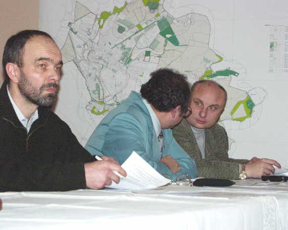 SCHVÁLENY ZMĚNY ÚZEMNÍHO PLÁNU JIČÍNA Hlavním bodem jednání pondělního zastupitelstva za účasti veřejnosti bylo projednávání změn územního plánu. Tyto změny jsou totiž nezbytným podkladem pro další rozvoj města, ať už z hlediska výstavby rodinných bytů, podniků či služeb. Návrh územního plánu, který přítomným osobně přednesl vedoucí územního plánování a rozvoje města Ondřej Bodlák, byl bez větších připomínek zastupitelstvem schválen. Konkrétně byly odsouhlaseny změny v lokalitách Allanovy sady, ulice Poděbradova, Lidické náměstí, Robousy, a Popovice, určené pro výstavbu rodinných domků, dále pak v lokalitách Větrov, kasárna vymezená především pro funkci služeb a další změny týkající se například rozšíření a opravy komunikační sítě. V průběhu jednání byly odsouhlaseny předložené majetkové záležitosti a v závěru byla předsedkyní kontrolního výboru zvolena Božena Chramostová. Naopak vzhledem k nemoci nemohl být do své funkce zastupitele přijat Josef Dvořák, který nahradí Jana Vaníčka. Na snímku jičínští zastupitelé Zdeněk Procházka, Jiří Drška a Pavel Nožička.